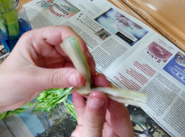 Taldeka lan egin genuen eta talde bakoitzak beirazko ontzi batean ura kolorante batekin (gorria edo urdina edo horia) ipini zuen. Gero, apio-zurtoinak sartu zituen eta 2 egunetan utzi zuen.
